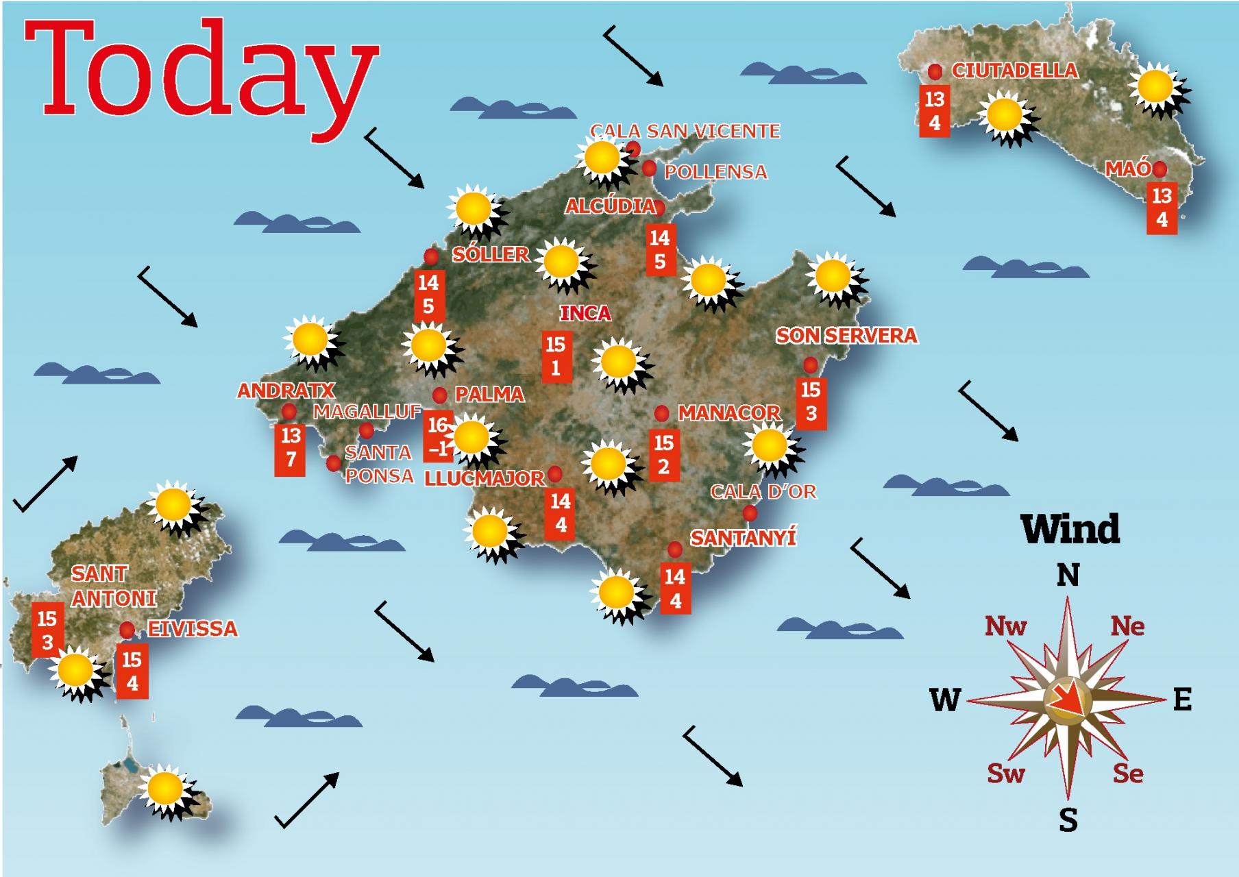 The State Meteorological Agency (Aemet) forecasts for Tuesday in the Balearic Islands skies with few clouds, constant or slightly rising temperatures and light frost in Mallorca and Ibiza.