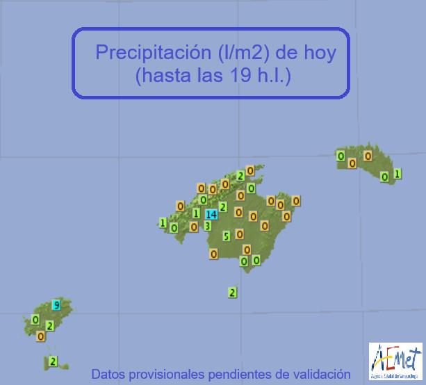 Thursday summary (to 7.30pm) - Highs of 30.8 Llucmajor, 30.5 Palma Port; 30.4 Porreres; Lows of 14.4 Son Torrella (Escorca), 16.7 Serra Alfabia (Bunyola), 17.9 Lluc; Rainfall of 14.0 litres per square metre Santa Maria del CamĂ, 4.8 Llucmajor, 3.3 Palma Airport.